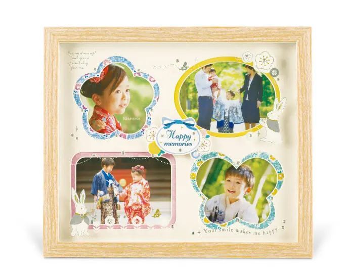 七五三やお宮参りなど、特別な記念日の写真を飾るのに最適なフォトフレーム。ガラスにプリントされた可愛らしいウサギや花のイラストは、和装はもちろん洋装にもピッタリです♪お子様の性別を問わずお使いいただけるマルチカラーのペーパーマットにガラスプリントが2層に重なり、中のお写真をより華やかに彩ります。